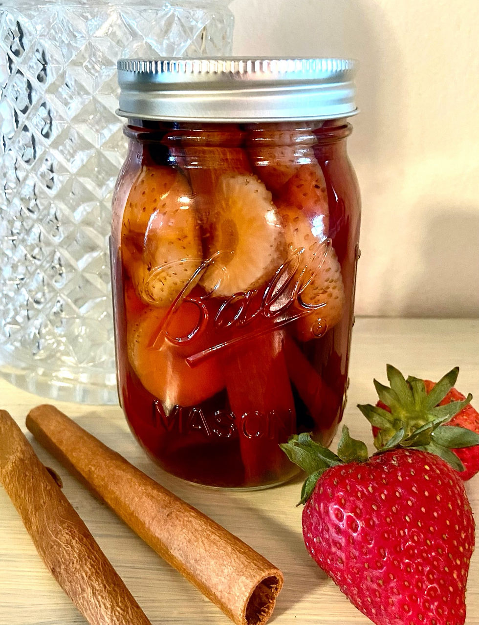 For this round of infusions I had several small jars with cinnamon/strawberry, ginger/strawberry, rhubarb/strawberry, gummy worms, pickles, and rhubarb. Strawberries were cheap, so I bought several containers and incorporated them in almost all my jars. To minimize waste I also used the strawberry tops, and the flavor was amazing! I did the same thing with the ginger, and utilized the entire root by leaving the skin on.